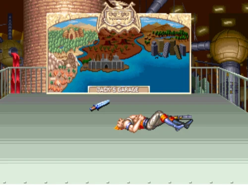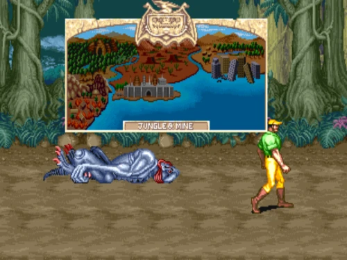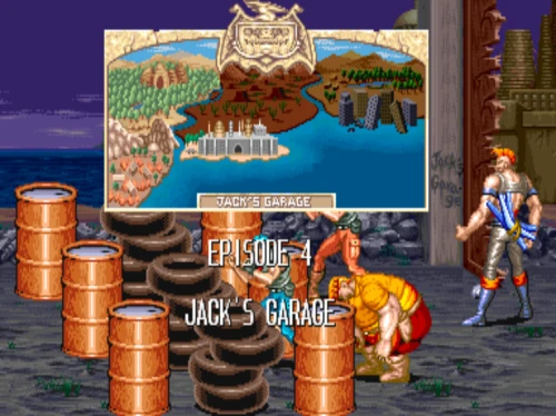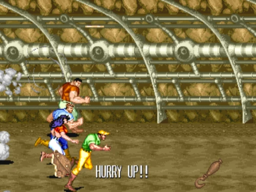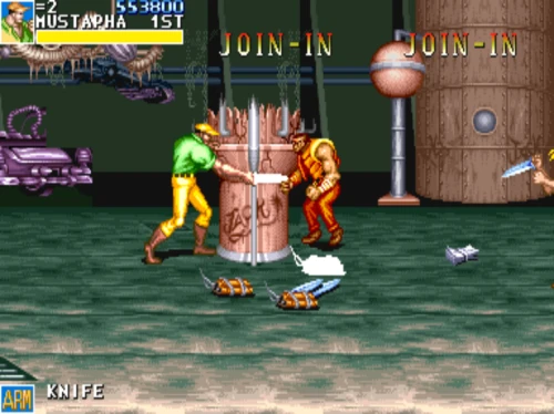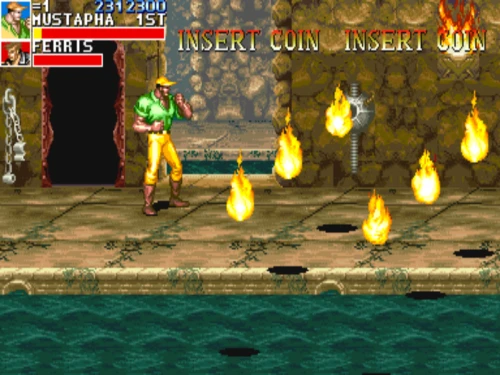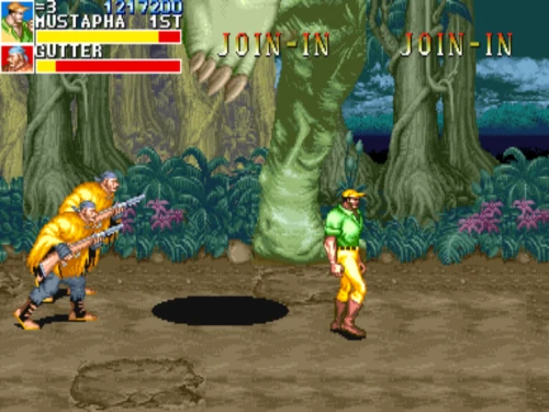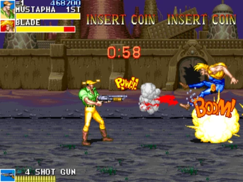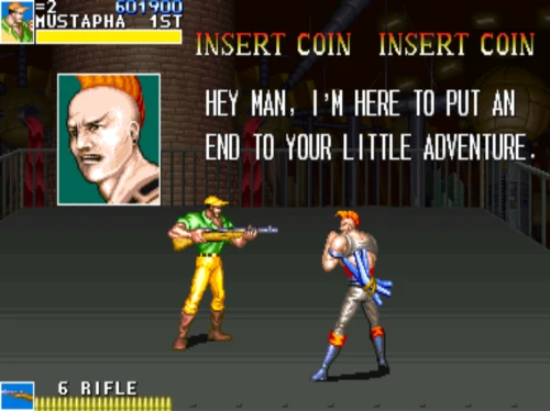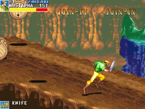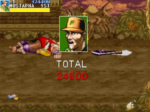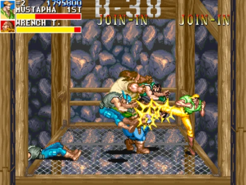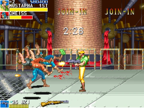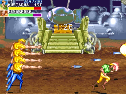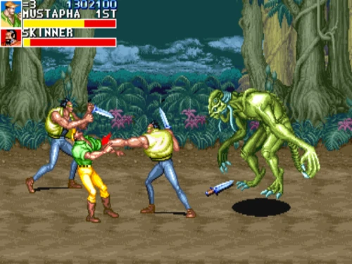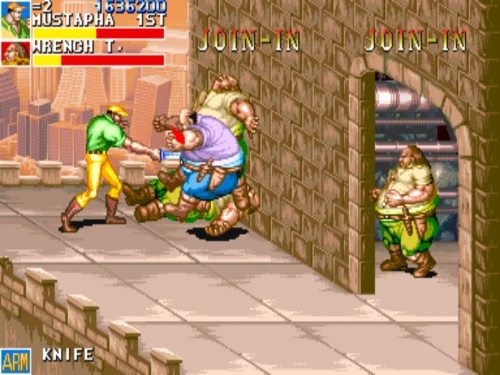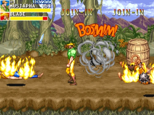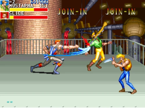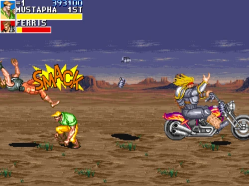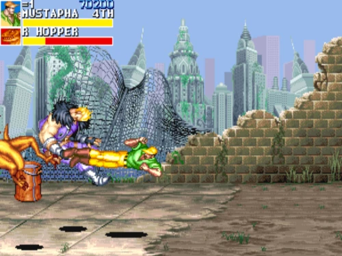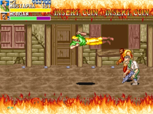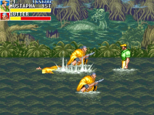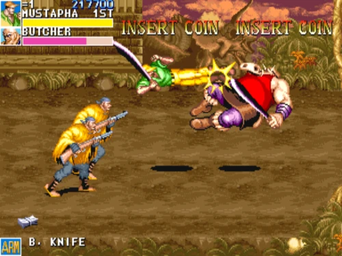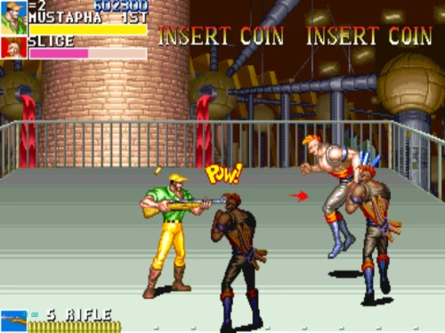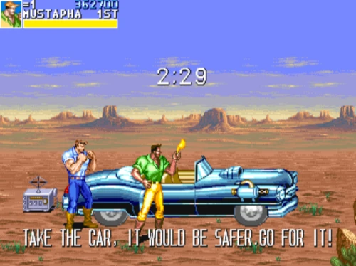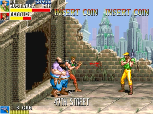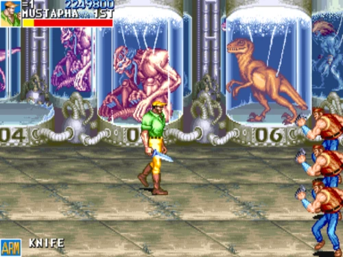 1스테이지는 원래 가볍게 클리어 하도록 해놨습니다. 캐딜락은 당시 벨트 스크롤액션 게임에서는 흔치 않았던 총기류를 무기로 사용할 수 있습니다. 스피드도 빠르고 타격감도 호쾌하기 때문에 무기를 얻게 되면 빠르게 적을 공격한 후 총알이 떨어지면 그것을 다시 잡아다가 던지면 또 맞습니다.