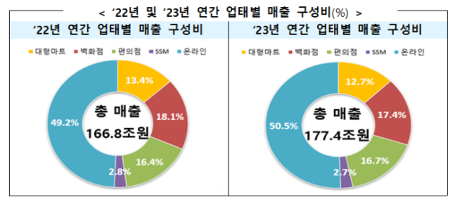 오프라인 유통 비중은 49.5%로 내려앉았다. 소형 가구 증가 영향으로 편의점 매출 비중이 0.3%P 증가했지만 대형마트(-0.7%P), 백화점(-0.7%P), 준대규모점포(-0.1%P) 매출 비중이 모두 감소했다. 전체 유통업체 매출은 177조4000억원으로 전년 대비 6.3% 증가했다.