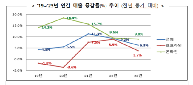 반면 오프라인 유통은 2019년과 2020년 역성장을 기록했다. 지난 2022년 엔데믹 전환과 함께 8.9%의 매출 증가율을 기록하며 온라인 유통과 격차를 좁혔지만 지난해에는 3.7% 성장에 그쳤다.